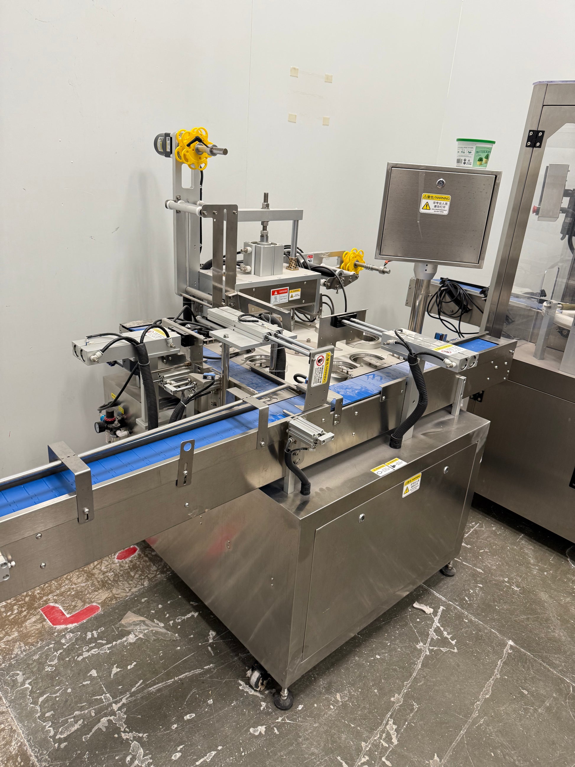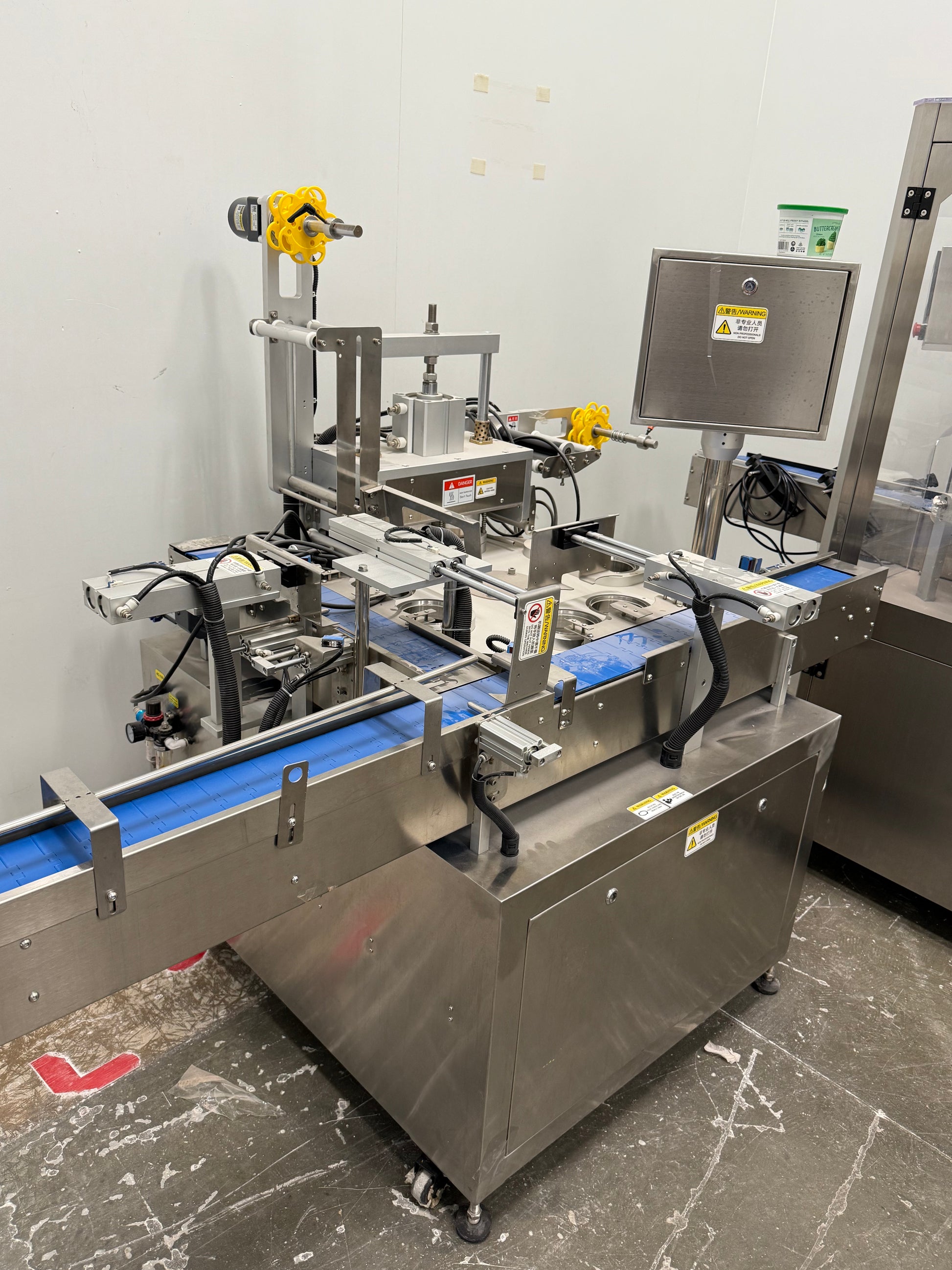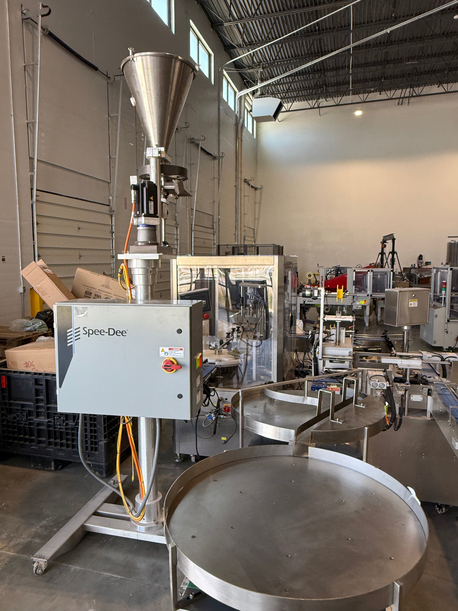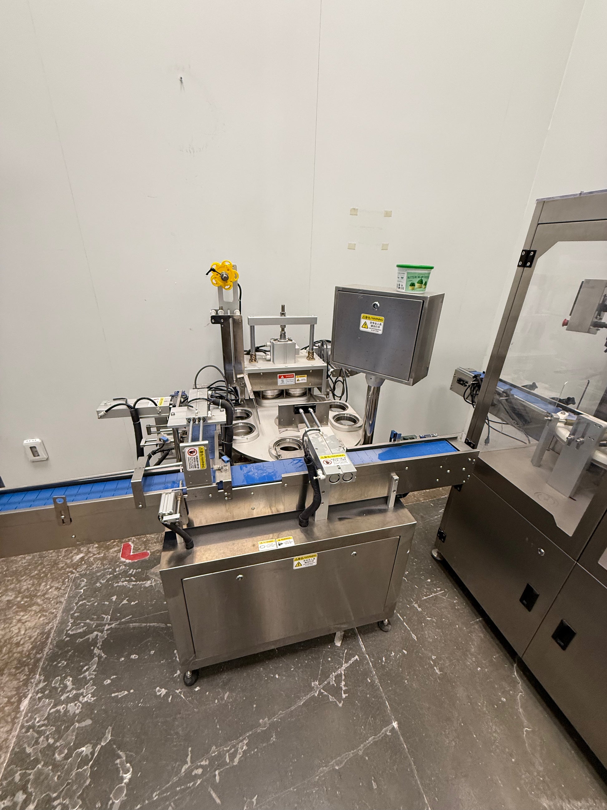 Tub Filler Model RFE50, Tub Sealer Model HGM30, Tub Capper Model DPC60, Spee-dee Filler Model CBS-234, with 2 curved conveyor sections The Equipment was used only 3 months. Purchased in 2021. Manufactured by Guangzhou Full Harvest Industries.