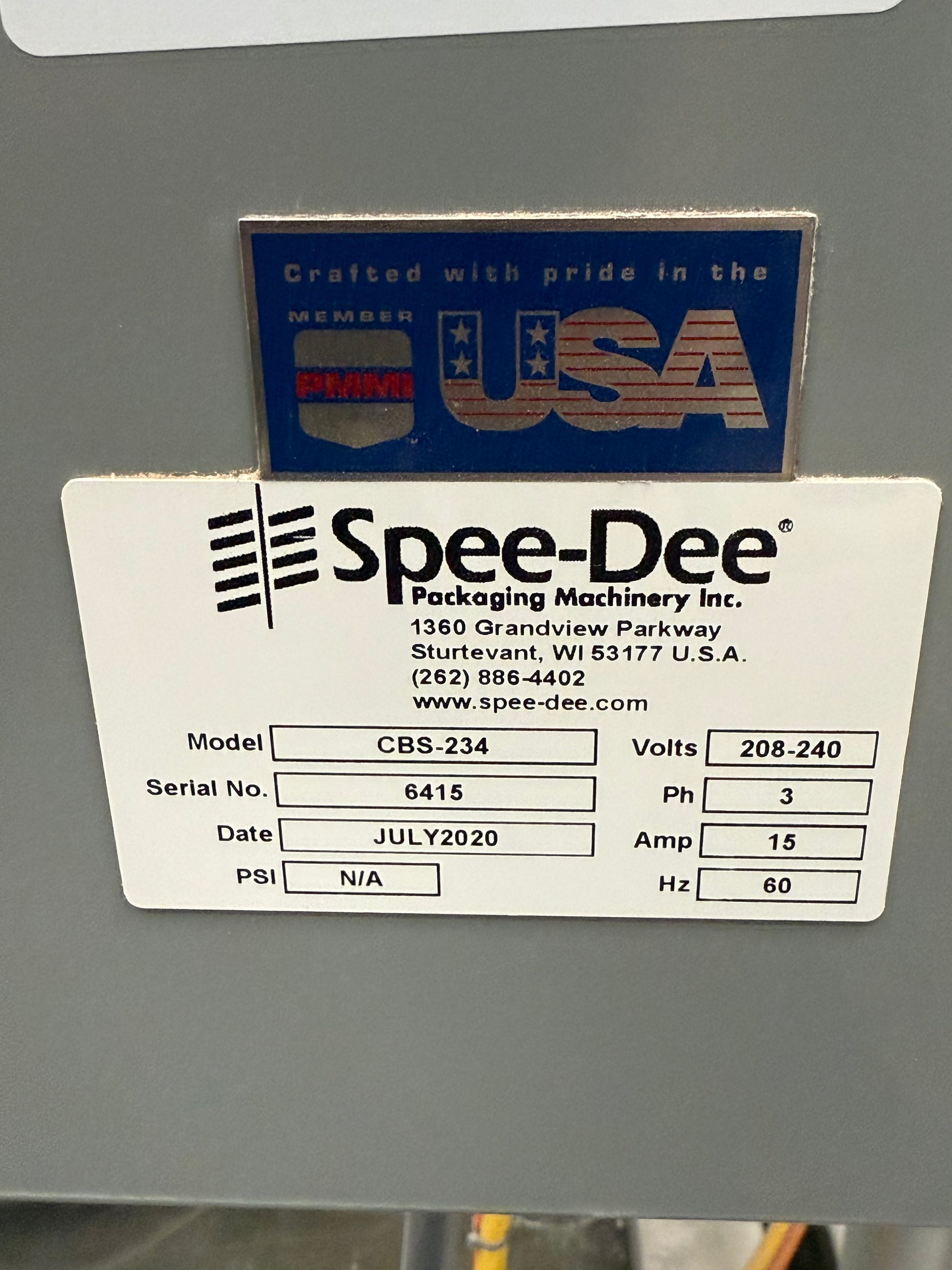 Spee-dee Filler Model CBS-234, Serial No 6415, Date Juoy 2020, volts 208-240, Phase 3, Amp 15, Hz 60